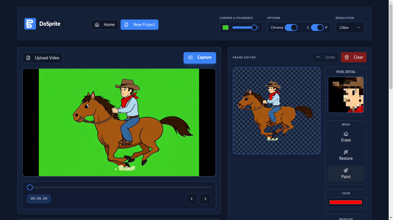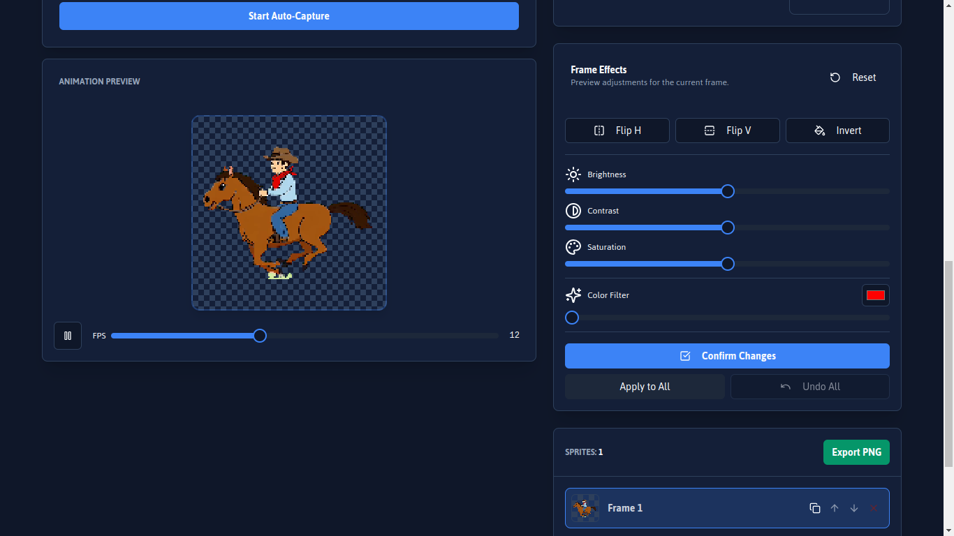 - Instant Pixel Art: Choose between three resolutions (64x64, 128x128, or 256x256 px). Your frames are automatically converted to your chosen resolution.